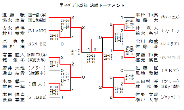 | 野沢 光毅 黒田 敬之 (フリー) | × 8-21 8-21 | × 19-21 18-21 | 3 | |