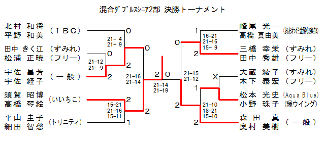 | XDS2-5 | すみれ・フリー | 三橋 幸栄・田中 秀雄 | 2 | 16-21 21-16 15- 9 | 1 | 峰尾 光一・高橋 真由美 | おおわだ金酔C. | |