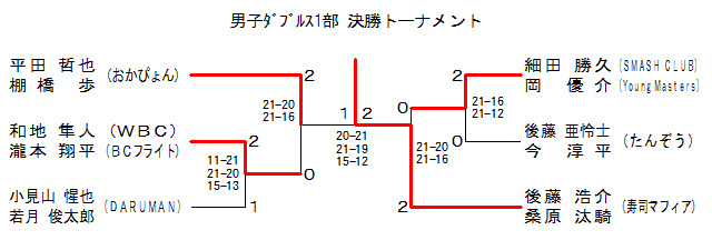 | MD1-4 | 寿司マフィア | 後藤 浩介・桑原 汰騎 | 2 | 21-20 21-16 | 0 | 細田 勝久・岡 優介 | SMASH CLUB・Young Masters | |