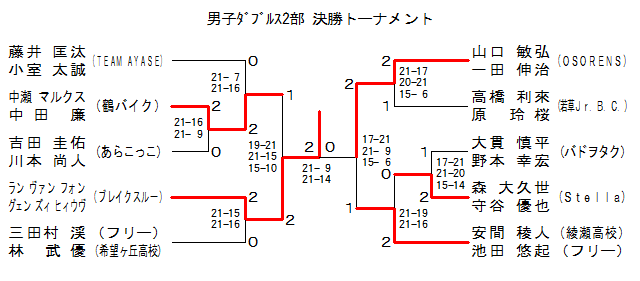 | MD2-B-4 | フリー・希望ヶ丘高 | 三田村 渓・林 武優 | 2 | 14-21 21-17 15- 5 | 1 | 松本 篤宏・石原 郁弥 | ホープスマイル | |