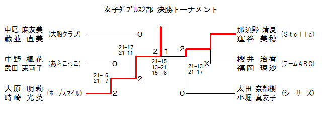 | WD2-3 | ホープスマイル | 大原 明莉・時崎 光葵 | 2 | 21-17 21-11 | 0 | 中尾 麻友美・藏並 直美 | 大船C. | |