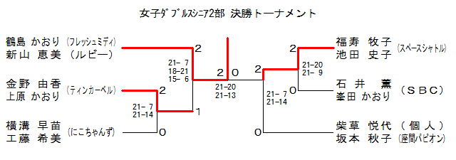 | WDS2-1 | ティンカーベル | 金野 由香・上原 かおり | 2 | 21- 7 21-14 | 0 | 横溝 早苗・工藤 希美 | にこちゃんず | |